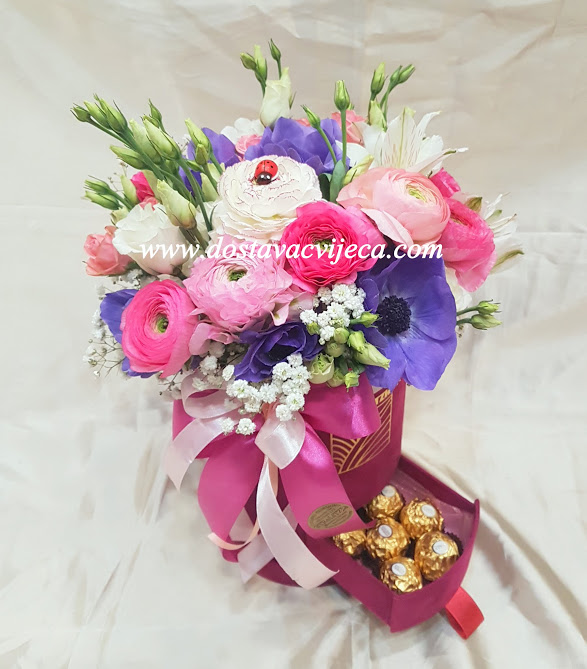Cvijećeu kutiji, moderan i sofisticiran znak ljubavi i pažnje. Cvijeće je pripremljeno tako da ostaje u kutiji i duže traje. Poklon kutija kvalitetne i fine izrade promjera (160×250), može poslužiti poslije za čuvanje dragih uspomena.Flower box je ispunjen šarenim sezonskim cvijećem( ovisno o sezoni) u gornjem djelu, a donji dio zauzima ladica koja je na povlačenje i napunjena je čokoladnim ferrero rocher kuglama. Možete odabrati između ciklama, zlatne i baršun crvene boje (naglasite u napomeni ako želite) Želite li odabrati neki od naših poklona, i time još više uveseliti primateljicu, odaberite u padajućem izborniku