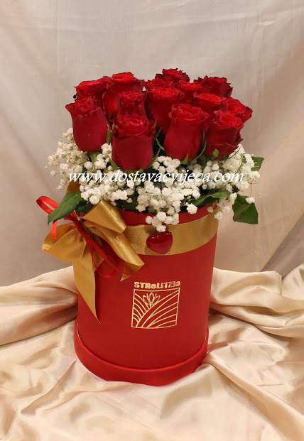 Ruže u kutiji, moderan i sofisticiran znak ljubavi i pažnje. Ruže su pripremljene tako da ostaju u kutiji i duže traju. Poklon kutija kvalitetne i fine izrade promjera (16×25 cm), može poslužiti poslije za čuvanje dragih uspomena. U kutiju ide cca 15-17 ruža ovisno o veličini ruže. Možete odabrati između šampanj, crvene i roze boje kutije, kao i boju ruža koju želite (naglasite u napomeni ako želite ) Možete odabrati neki od naših finih poklona, i time još više uveseliti primateljicu. Povećati količinu ruža moguće u padajućem izborniku.