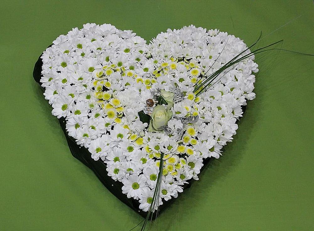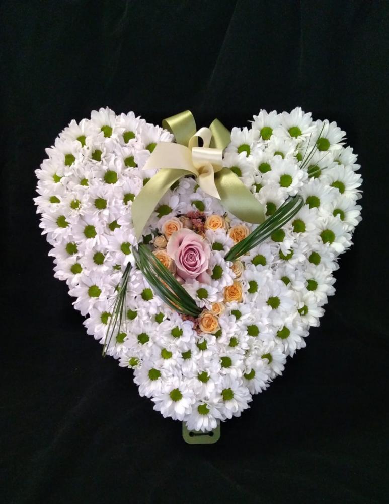 Grobni aranžman- srce- standardne veličine cca 40cm, sastoji se od bijelih margareta i nježne ruže. Na slici je prikazan *ekstra aranžman. Želite li margarete u drugoj boji, molimo da nas kontaktirate prije narudžbe. Moguće naručiti svijeće prikladno upakirane. Zaprimamo narudžbu minimalno dan prije dostave na ispraćaj.