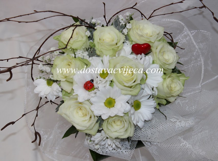 Prozračan buket s ružama (standardni buket 7 komada) i sitnim cvijećem, nježan poput pahuljice, razveselit će svaku nježnu dušu koja ga dobije na poklon.