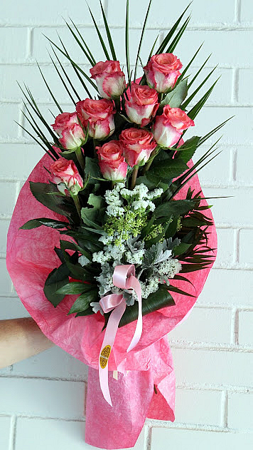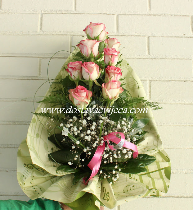 Lijepi buket s pet rozih ruža, aranžiran za svaku prigodu. Stanardni buket je s 5 ruža Veličina standardnog buketa cca Φ30cm, visina 60 cm. Ukoliko želite naručiti više od 5 ruža, u padajućem izborniku izaberite broj ruža.