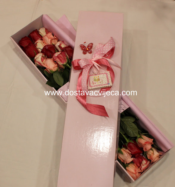 Standardni buket sastoji se od 3 ruže u različitim bojama. Veličina ukrasne kutije 50X30cm, povezana je ukrasnom mašnom. Vašu poruku privežemo na ruže i poklon buket je kao takav diskretan, idealan za firme i druge ustanove. Poklanjamo u znaku prijateljstva, ljubavi… Na slici je primjerak od 18 ruža. Želite li naručiti veći broj ruža, u padajućem izborniku naznačite količinu. Maksimalno 31 ruža. Pravilo darivanja je neparan broj ruža, ukoliko nije godišnjica ili slično.