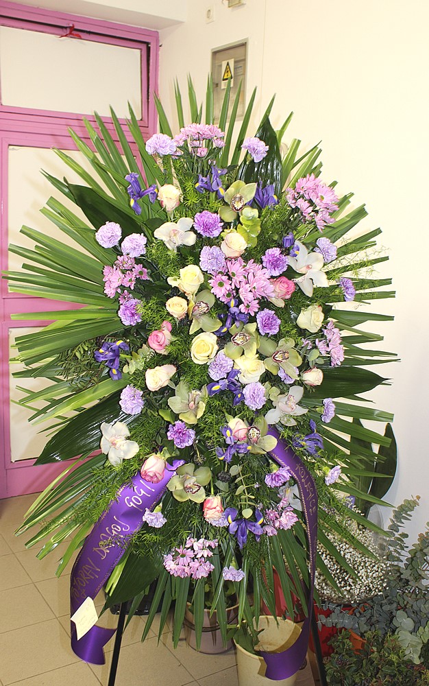 Lijepi i veliki vijenac dimenzije 150x60cm, sastoji se od ruža, margareta, orhideja, sezonskog cvijeća i zelenila. Na slici je prikazan * mega vijenac.