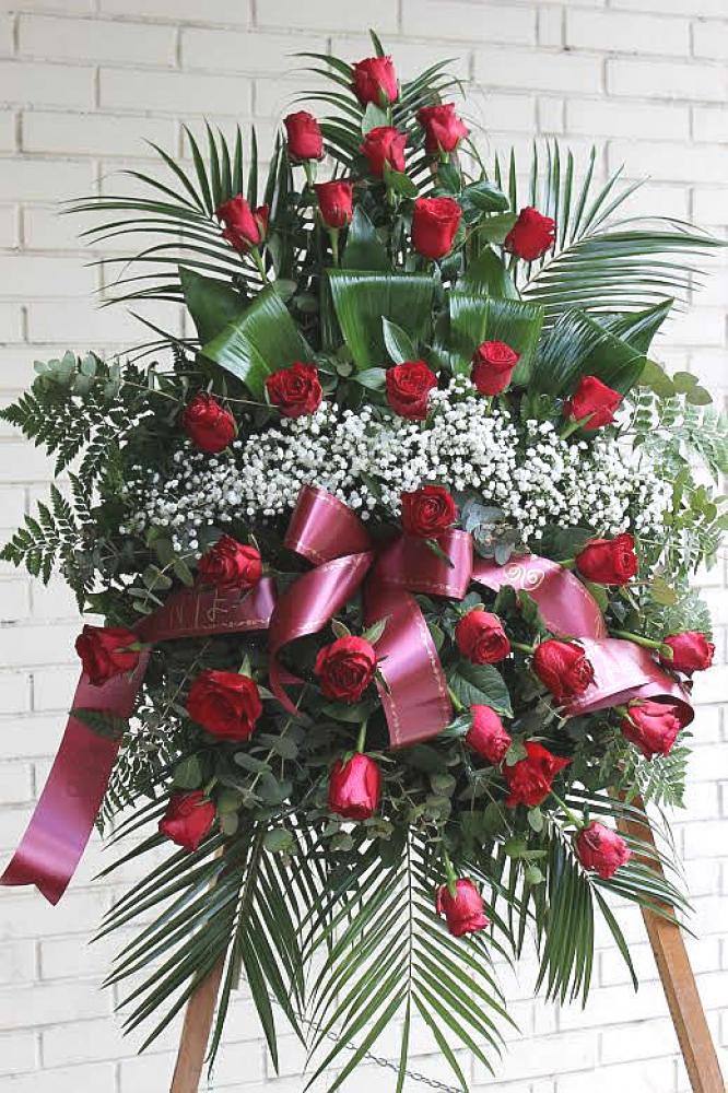 Profinjen dizajnerski vijenac standardne veličine 100X80cm, s posebnom pažnjom izrađujemo od lijepih crvenih ruža, finog sezonskog cvijeća i zelenila.