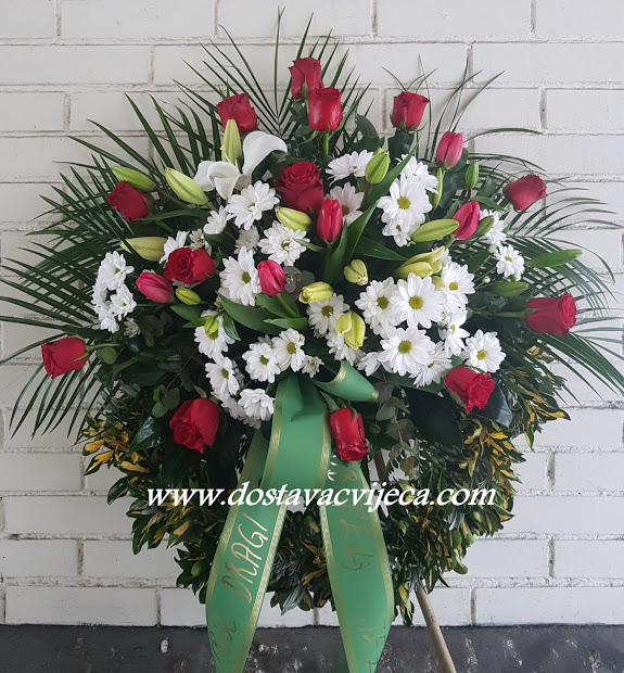 LIjep i profinjen vijenac za posljednji ispraćaj, s posebnom pažnjom za vama drage osobe izrađujemo od crvenih ruža, ljiljana, margaritela, sezonskog cvijeća i finog zelenila. Veličina vijenca 100x80cm.Želite li bogatiji vijenac s više cvijeća odaberite u padajućem izborniku..Poželjno je naručiti barem dan ranije..